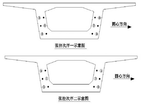 同截面張拉順序問(wèn)題:先要根據(jù)施工方法相應(yīng)的受力要求確定。對(duì)于可同工況張拉的同類(lèi)型鋼束(例如都是短束、或都是長(zhǎng)束),應(yīng)遵循對(duì)稱(chēng),由內(nèi)向外的原則。例如先張拉腹板束,再?gòu)埨數(shù)装?。其?shí)對(duì)于直線橋,截面張拉順序?qū)?yīng)力影響不大,可靈活調(diào)整。但是對(duì)于彎橋,研究證明,遵循對(duì)稱(chēng)張拉的大前提下,宜先張拉外側(cè)腹板束,再?gòu)埨瓋?nèi)側(cè)腹板束。原因是外側(cè)鋼束會(huì)使曲率降低而內(nèi)側(cè)鋼束則會(huì)增大曲率,即“外側(cè)安內(nèi)側(cè)危險(xiǎn)”。如下圖所示。